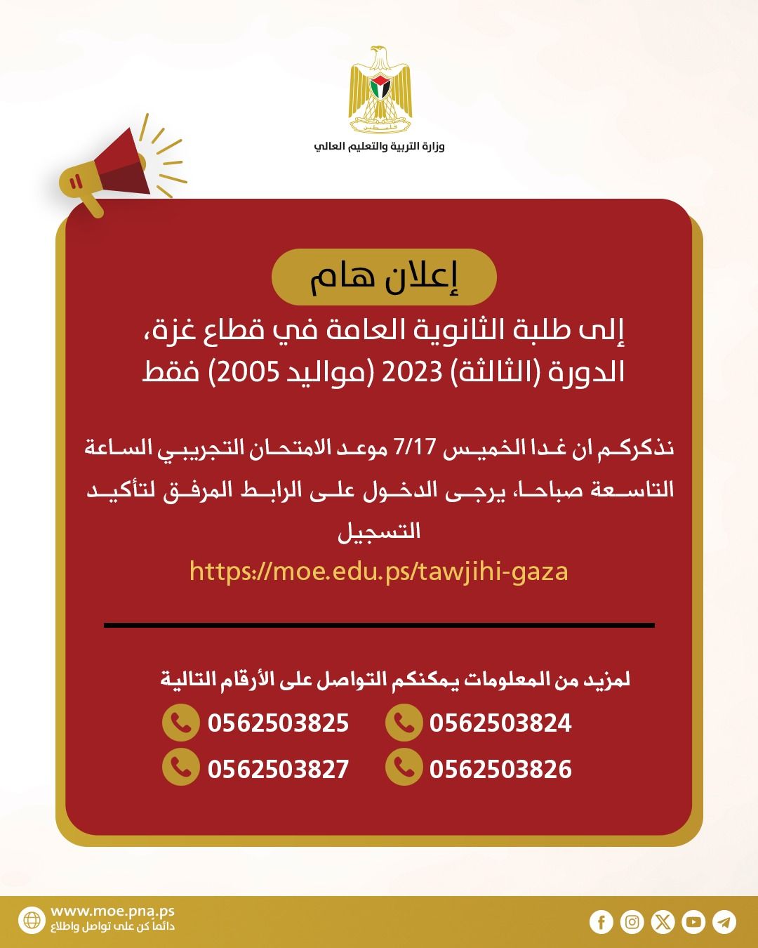 إعلان هام | لطلبة الثانوية العامة في قطاع غزة – الدورة الثالثة 2023 (مواليد 2005 فقط)