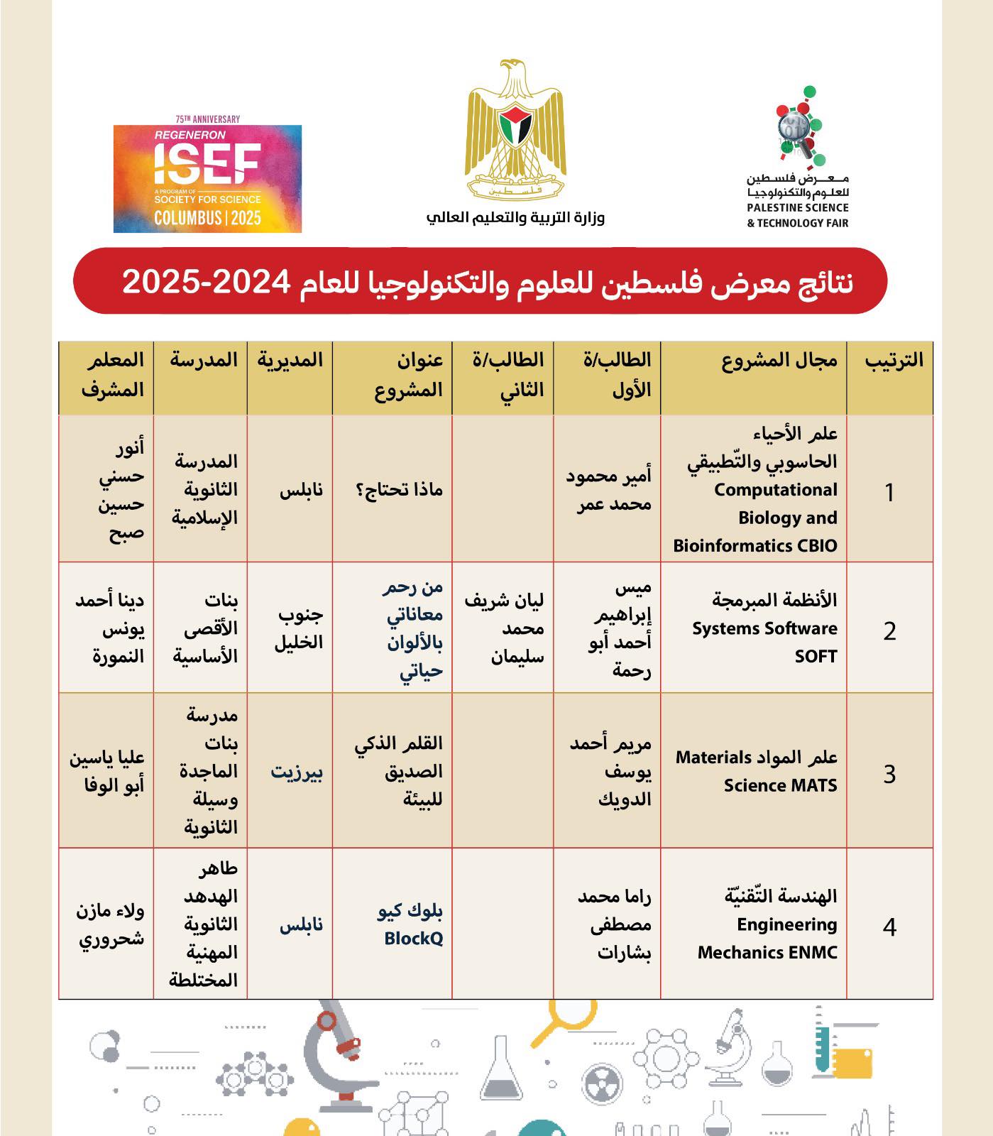 إعلان نتائج معرض فلسطين للعلوم والتكنولوجيا للعام 2024/2025