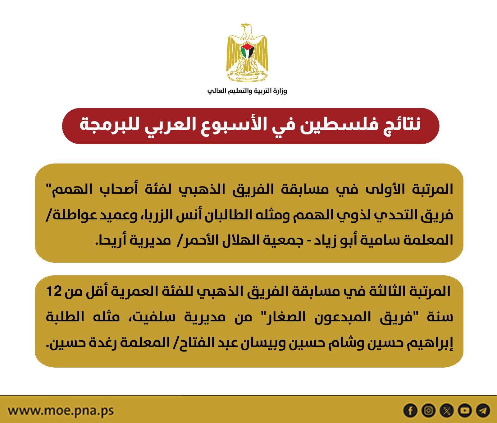 علنت وزارة التربية والتعليم العالي حصول فلسطين على المركزين الأول والثالث في مسابقتين من فعاليات الأسبوع العربي للبرمجة في دورته الرابعة تحت عنوان: "الذكاء الاصطناعي في خدمة اللغة العربية"، التي نظمتها المنظمة العربية للتربية والثقافة والعلوم (الألكسو)، بالتعاون مع مجمع الملك سلمان العالمي للغة العربية والجمعية التونسية للمبادرات التربوية.