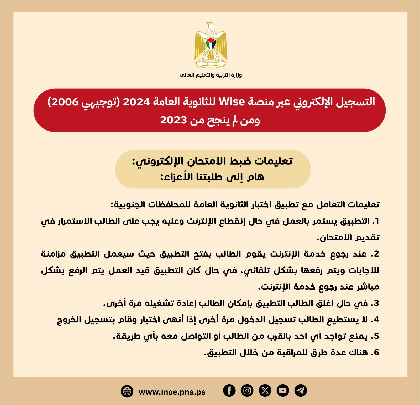 تنويه لطلبة الثانوية العامة لعام 2024 لطلبة غزة